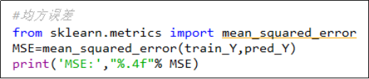 MSE(Mean Square Error):均方误差,是真实值与预测值的差值的平方,然后求和的平均,一般用来检测模型的预测值和真实值之间的偏差。MSE取值越小,说明模型的准确度越高。MSE原理计算公式如下,Python代码实现如图9所示。
