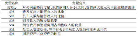 参照Bentley 等(2013)的研究,本文将上述6个变量取过去5年的平均值。对于上述前5个变量,在每一个“年度一行业”样本中从小到大平均分为5组,最小的组赋值为0分,次小的组赋值为1分,以此类推,最大的组赋值为4分;对于第6个变量分组方式相反,即最小的组赋值为4分,最大的组赋值为0分。对于每一个“公司一年"样本,将6个变量的分组得分相加,得到0-24分的度量变量STRA。较高的STRA值意味着公司战略较为激进,而较低的STRA值意味着公司战略较为保守。