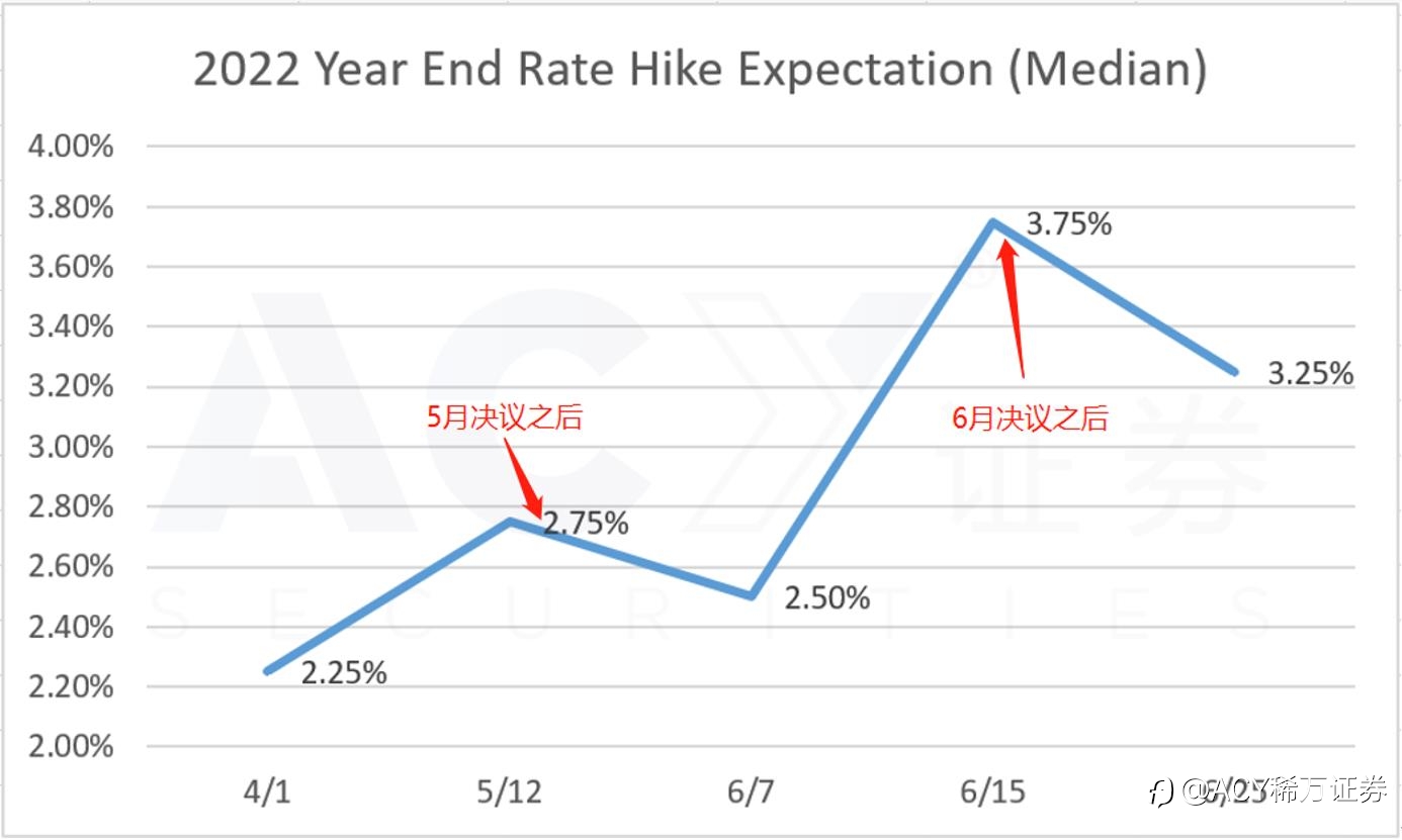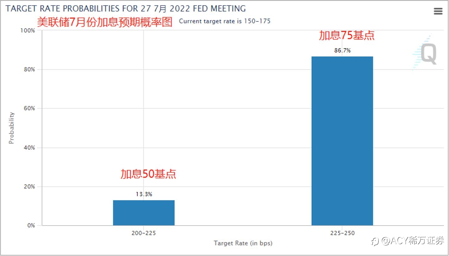 另一方面,从FedWatch的7月份加息预期概率图来看,有85%的交易员押注美联储加息75个基点,而押注50个基点的才不到15%。由此可见,短线预期有见顶的迹象。除非今晚鲍威尔提到加息100个基点,否则今晚美元升值,股市贬值的空间并不大。有意思的是,鲍威尔在之前讲话中提到,不要太过相信经济衰退的论调,但同时又承认市场对政策的预期越来越准确。(6月9日之后,预期大涨至75基点,当时美联储已经进入静默期。)这种前后矛盾的讲话,体现美联储的立场与态度的纠结。这种纠结同样体现在预期的波动当中。