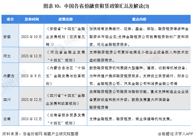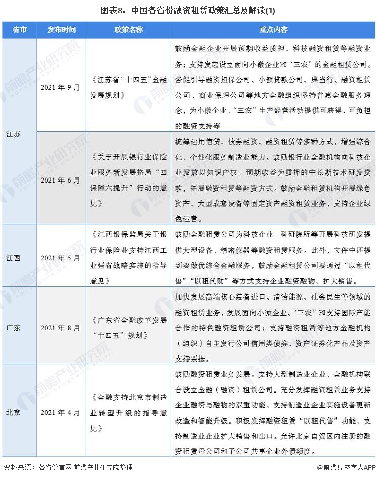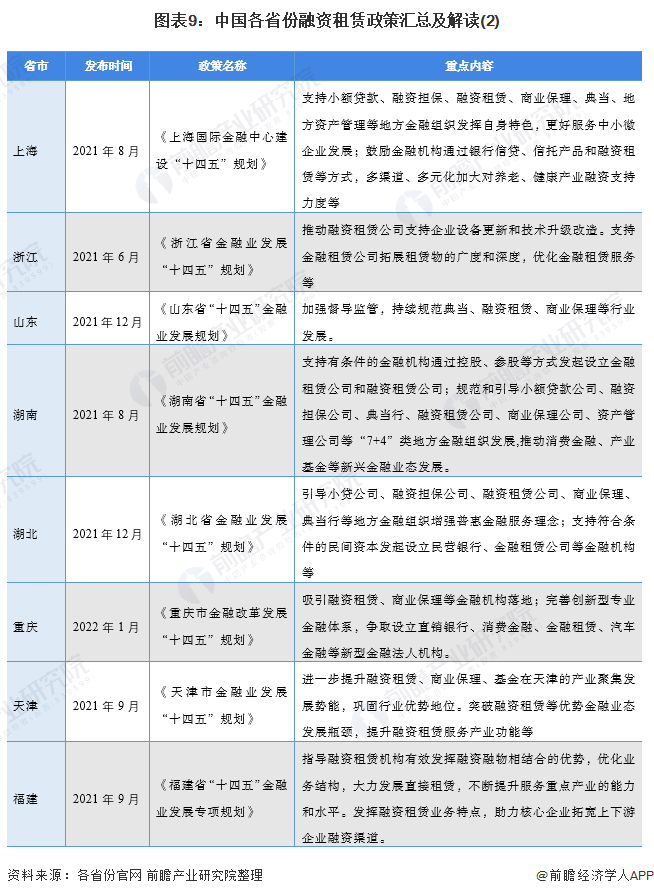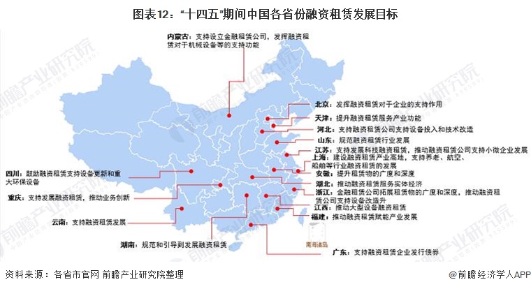 “十四五”期间,我国主要省份也提出了融资租赁行业的发展目标,包括推动融资租赁做好实体经济的支持作用,加快融资租赁创新发展等: