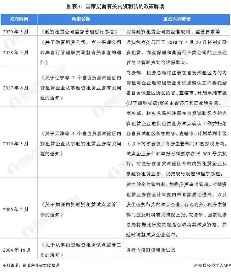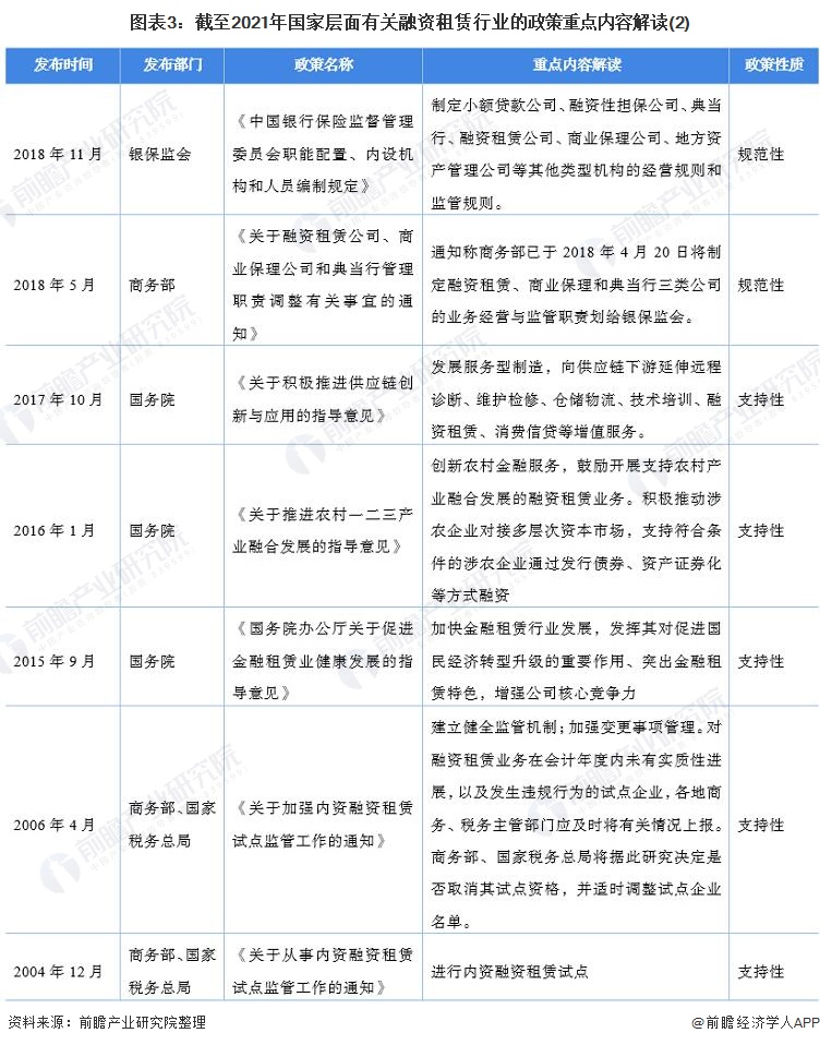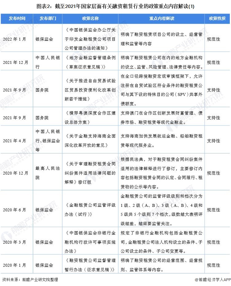 目前,国家层面的融资租赁政策以规范性政策为主,包括金融租赁公司、融资租赁公司设立、经营、监管等方面的规范性文件。支持性文件主要包括允许在自贸区发展融资租赁业务等内容。