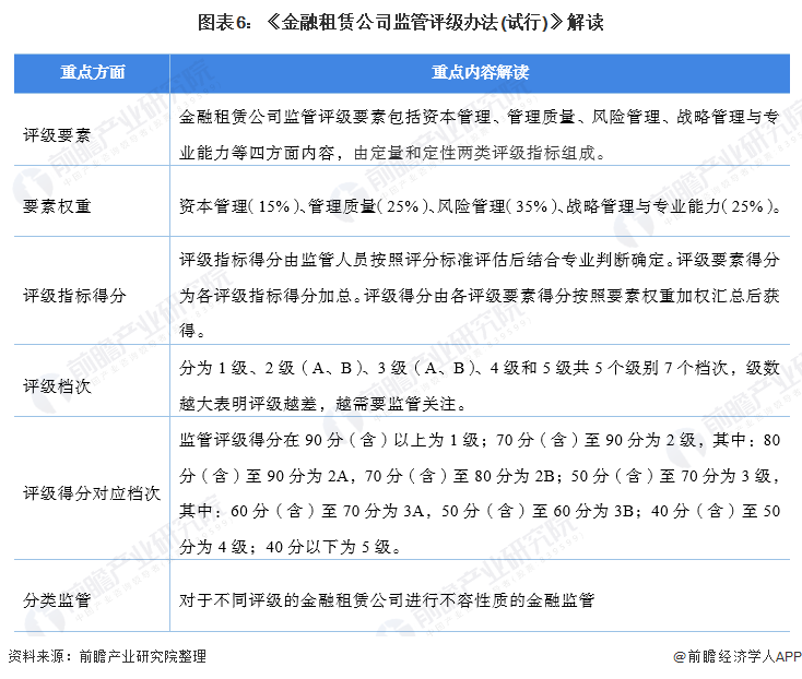 2020年6月中国银保监会发布《金融租赁公司监管评级办法(试行)》,提出了定量和定性的评级方法,明确了金融租赁公司监管评级操作规程,将金融租赁公司监管推向了新的方向。