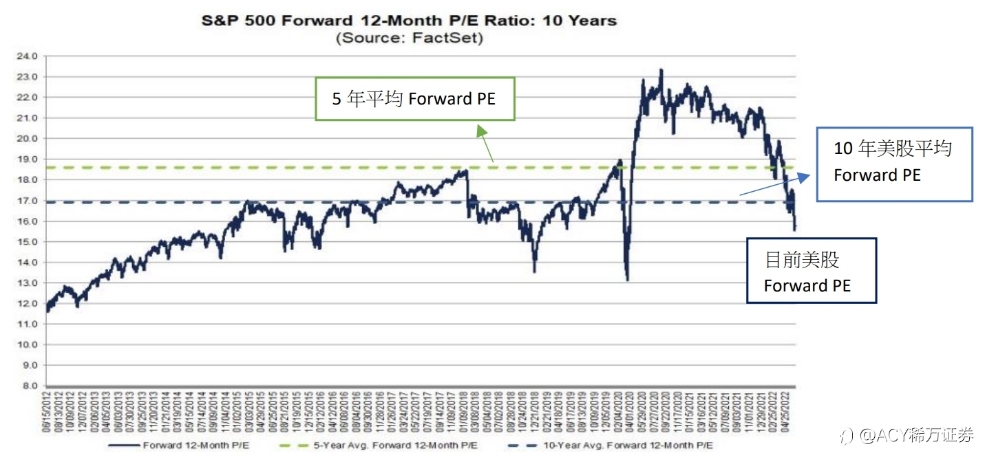 从估值的角度分析,美股市场年至今以来已经落入跌幅超过20%的熊市,我们知道市盈率(P/E ratio)是将每股价格除以每股盈余,可以用来衡量股价目前是否位于合理价位,而Forward PE是使用预期未来一年的每股盈余来计算的比率,比起使用目前的每股盈余,使用未来一年的数值更贴近预估的真实情况。而目前美股大盘(S&P500)未来一年的市盈率为15.8,低于5年平均18.6和10年平均16.9,以估值的角度来看目前确实为相对便宜的进场价位,长线投资人可考虑以分批进场的方式买入。