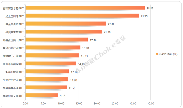 值得注意的是,虽然大多数REITs上市后取得了较好的收益,但仍需关注其价格波动风险。从年化波动率来看,3只收费公路REITs波动率较低,均低于12%;环保类富国首创水务REIT年化波动率最高,达33.25%。