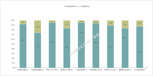 从投资结构来看,首批上市的9只REITs以机构投资者为主。根据2021年底基金份额持有人结构数据显示,机构投资者占比最高的为平安广州广河REIT和中金普洛斯REIT,达95%;个人投资者占比最高的为中航首钢绿能REIT,达26%。