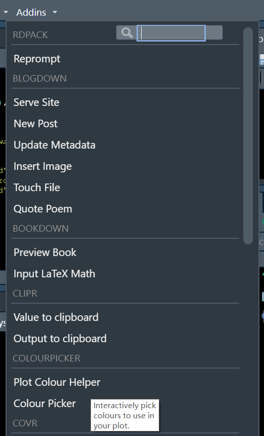 首先安装colourpicker包,然后你的Rstudio就会出现颜色选择的插件了Plot Color Helper,有了它你就可以非常方便地选出来你想要的颜色并得到颜色的表示方法:
