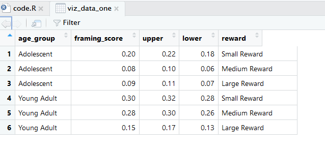 可以看到数据中有我们画柱状图需要的score和误差线需要的upper和lower的值,和分组变量reward。