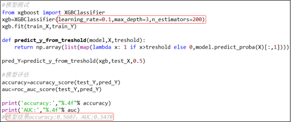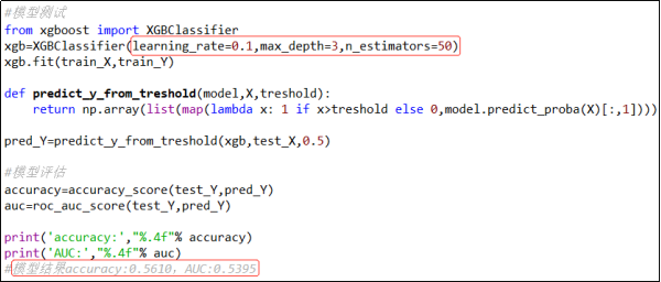 XGBoost模型的默认参数如图3所示,在这样输入参数组合下的模型性能指标为accuracy=0.5373、AUC=0.5319(参见上图模型评估print结果)。对于模型的参数调优往往是一个必然过程,而结合实际建模经验,图3中的参数n_estimators(树的数量)、max_depth(树的深度)、learning_rate(学习率)等都是模型调参的主要对象。