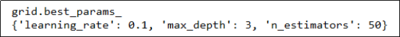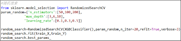 现对参数n_estimators、max_depth、learning_rate分别各取3种情况,这里需要注意的是,最好将模型默认参数也放入其中(n_estimators=100、max_depth=6、learning_rate=0.3),便于最终的模型性能对比。这里为了提高效率仅做示例,模型调优各参数的取值分布为:n_estimators={50,100,200},max_depth={3,6,10}、learning_rate={0.1,0.3,0.5}。针对模型参数调优的网格搜索实现过程如图4所示,最后通过best_params_输出最优参数组合如图5所示。