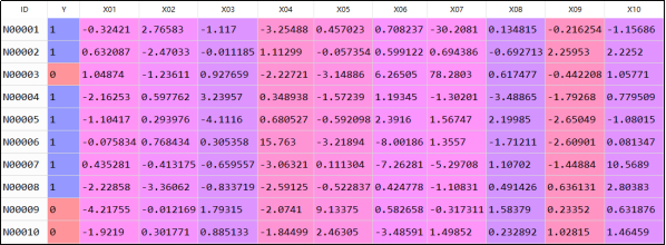我们先来了解下案例场景,建模样本数据共包含10000条样本与10个特征,部分数据样例如图1所示,其中ID为样本主键,X01~X10为特征变量,Y为目标变量(取值二分类1/0代表是否违约),场景具体需求是通过特征变量池,建立一个针对风控贷前环节的申请用户违约预测模型。