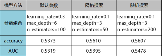 从模型最终结果来看,调优后模型的accuracy(0.5610)、AUC(0.5395)与之前默认参数下模型的accuracy(0.5373)、AUC(0.5319)均有一定提升,说明网格搜索对模型参数调优的有效性。