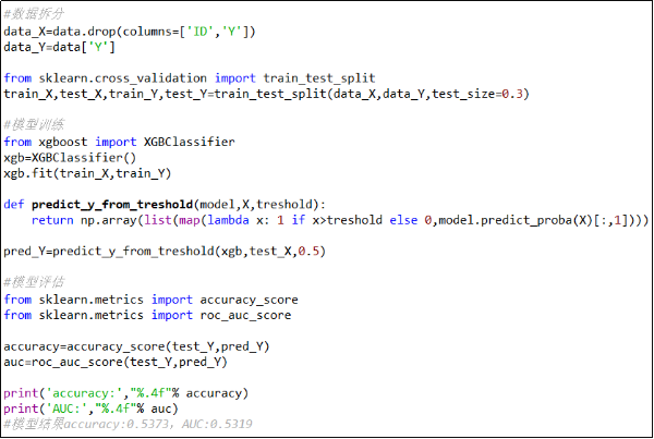 下面我们将建模数据按照7:3比例随机拆分为训练集与测试集,并采用算法的默认参数组合在训练样本集上来训练拟合模型,同时通过测试样本集上来评估模型的效果,具体实现过程与模型指标结果如图2所示。