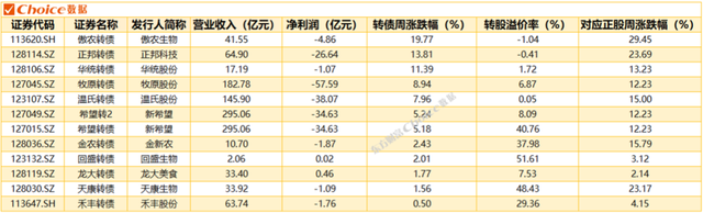 从对应正股表现来看,周涨跌幅最高的前三名为傲农转债、正邦转债、天康转债,对应周涨幅均大于其转债周涨幅。