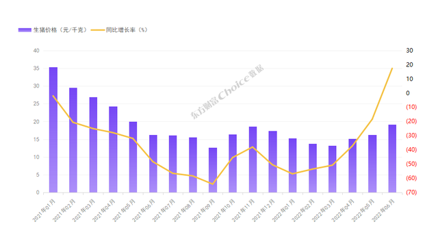 具体来看,自年初以来,国内生猪价格从2021年底的17.34元/公斤,持续回落至3月底的13.22元/公斤。进入二季度,受养殖户压栏惜售及猪肉收储提振信心等因素推动,生猪市场出现周期反转行情,生猪价格快速上涨,截至6月底,生猪价格已回升至19.12元/公斤。