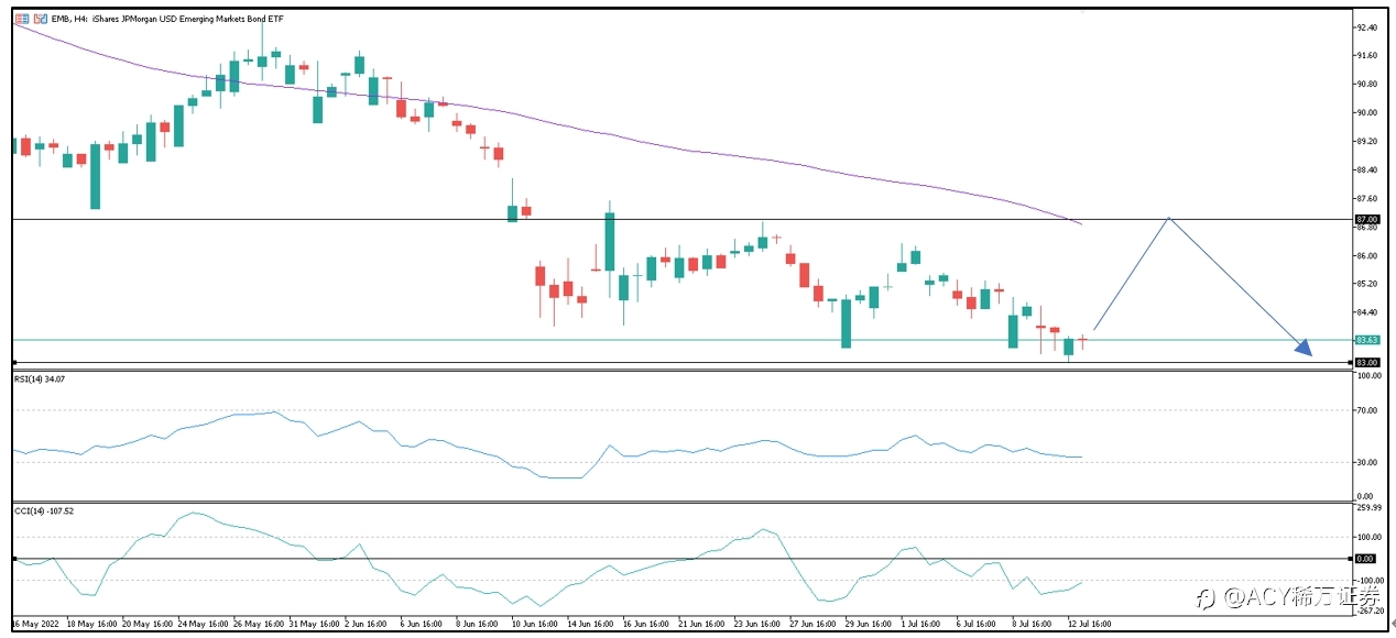 从新兴市场债ETF(代号EMB)的4小时图来看,60MA趋势向下,目前价位持续在83-86区间震荡,RSI相对强弱指标位于50以下徘徊,显示整体股价力道相对弱势,反弹力道也很薄弱,目前价位已跌破2020年疫情时的低点,虽然我们长线并不看好新兴市场债,然未来再持续下跌的空间也有限,加上目前RSI相对强弱指标位于30左右低档徘徊,可能短期会看到一个反转讯号,股价若有短期反弹上方压力位置在87,若股价无法突破此价位,可配合CCI向下突破0线作为卖出交易讯号,整体交易策略以随消息面做空为主。