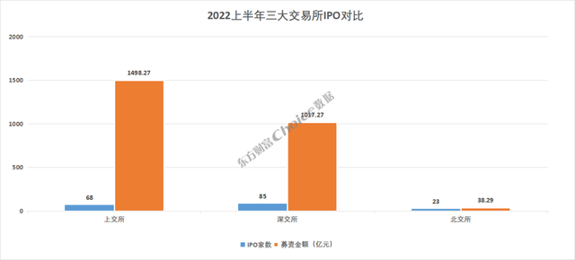 分交易所来看,今年上半年,上交所IPO公司68家,募资金额1498.27亿元;深交所IPO公司85家;募资金额1017.27亿元;北交所IPO公司23家,募资金额38.29亿元。