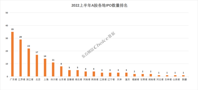 从各省市的情况来看,上半年广东省IPO企业数量达到35家,排名全国首位;江苏、浙江分别为29家、22家,排名第二、第三。