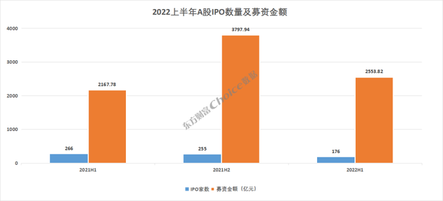 上半年,A股市场有176家企业首发上市,共募集资金2553.82亿元;相比2021年同期,IPO企业数量减少了90家,但募资资金规模实现了386亿元的增长。