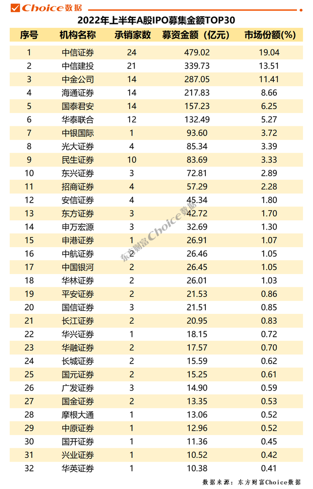 上半年,中信证券首发承销企业24家,在所有券商中位居首位;排名第二的是中信建投证券,首发承销21家企业;中金公司、海通证券、国泰君安均为14家。