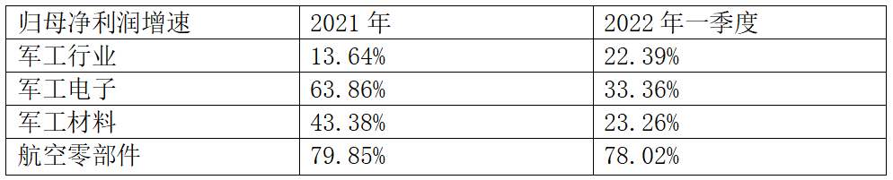 作为上游的军工电子、材料板块在2021-2022年一季度的归母利润增长速度明显超过整个军工行业。