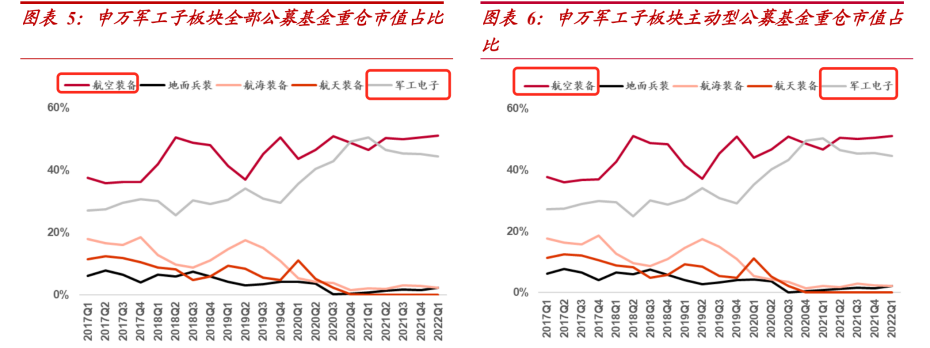 可以见到军工板块里的航空装备及军工电子板块是公募基金重仓的方向,其中军工电子板块是公募2020-2021年增持的主要方向,而航空装备属于长期处于较高仓位运行的板块。