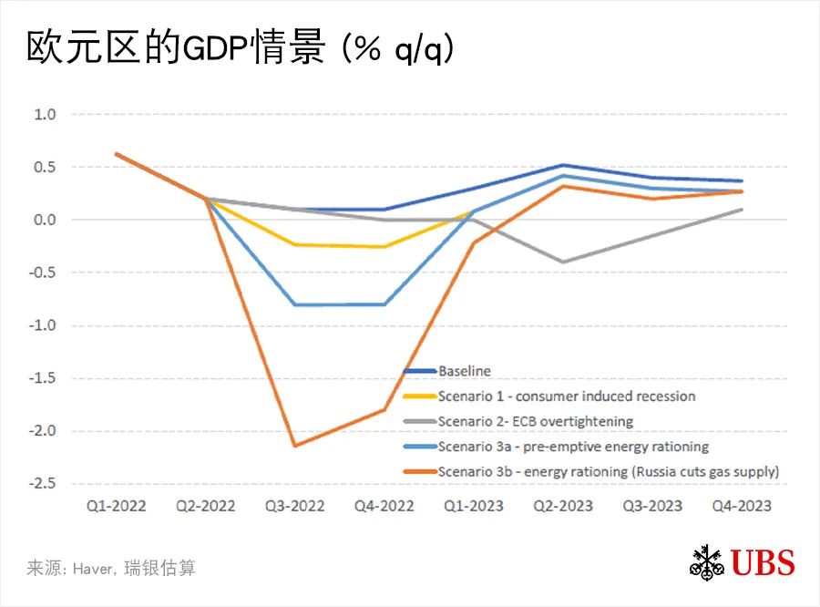 在这一情景下,欧洲开始主动实施能源配给制度,以填充储气设施——本质上是消费带动的经济衰退的更极端版本,通胀率上升(GDP下降1.6个百分点,通胀率到23年中期高出2.5个百分点)。