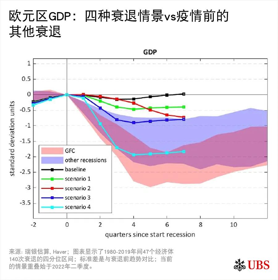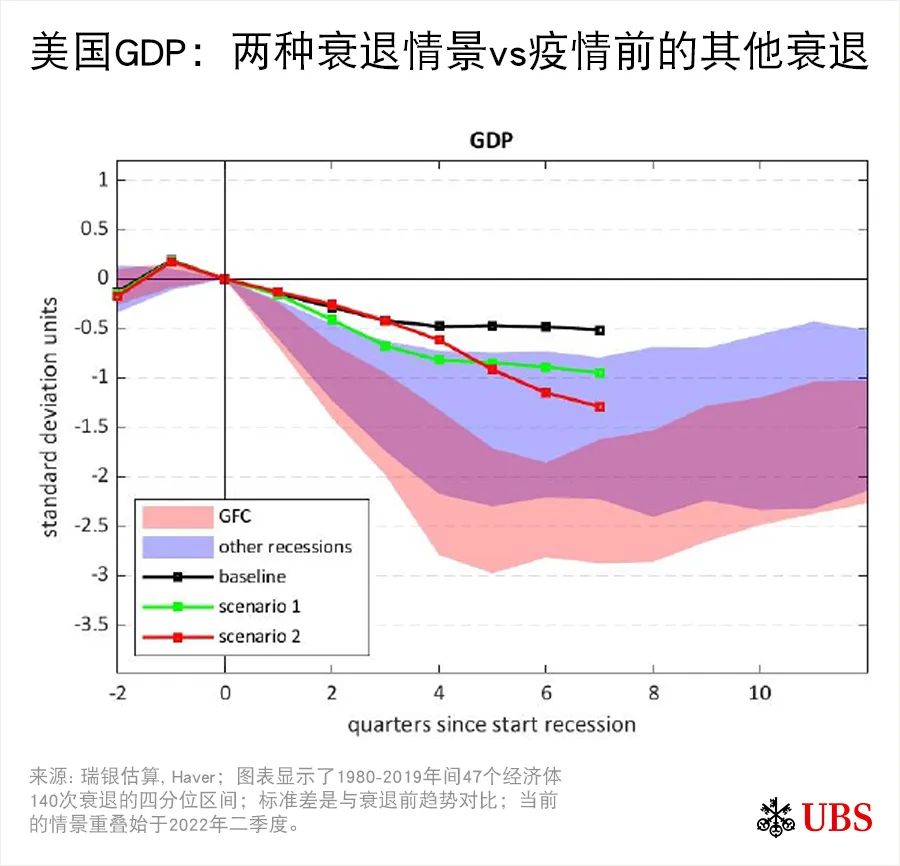 在这一情景下,对服务的被压抑需求和动用储蓄的效应消散,消费与实际可支配收入一同出现负增长;美国/欧元区的GDP收缩6-8个月,GDP水平下降0.5-0.7个百分点(大约处于疫情之前过去147次衰退中的第25个历史百分位)。