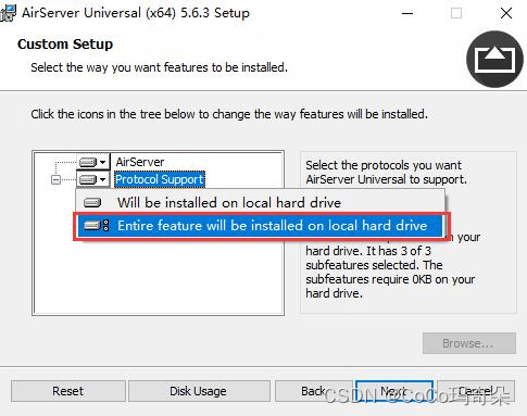 一路点击“Next”进入到下图3所示界面中,在此界面中,我们点击安装组件前的图标按钮,然后选择“Entire feature will be installed on local hard drive”,将包含的各种组件都安装在本地硬盘中,再点击“Next”进入下一步骤。