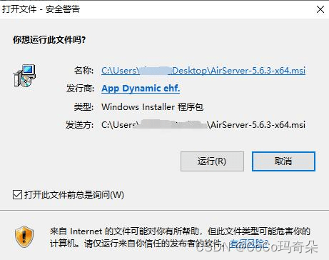 下载后我们会得到一个MSI格式的安装包,双击打开它,再点击“运行”按钮开始运行安装程序。