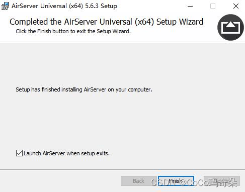 等待安装包加载安装程序后,最后进入到图7所示界面中,表示AirServer软件已经安装成功,点击“Finish”按钮即可。