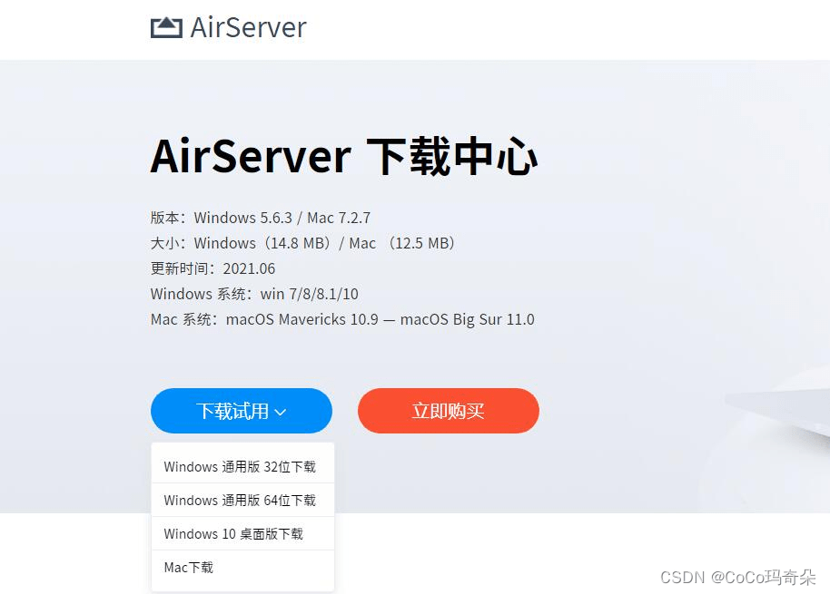 首先我们AirServer下载对应的操作系统软件安装包,目前AirServer可在Windows系统和Mac系统上稳定运行。这里我选择Windows 通用版进行下载。