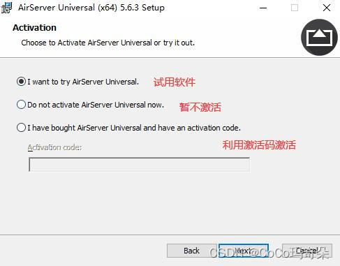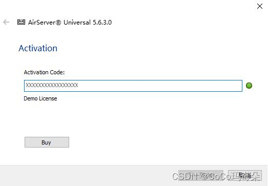 了解完安装步骤,我们再看看如何激活AirServer软件。首先是我们的AirServer Windows通用版,如果我们购买了激活码,则可以使用激活码激活AirServer软件。点击右下角任务栏的AirServer图标,选择其中的“Activation”菜单进入激活页面。