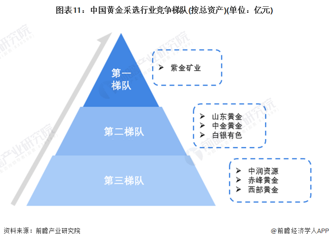目前我国黄金行业依据企业的资产水平划分,可分为3个竞争梯队。其中,注册资本大于1000亿元的企业仅有紫金矿业集团;总资产在100-1000亿元之间的企业有:中金黄金、山东黄金、恒邦股份和白银有色等;其余大部分企业的总资产在100亿元以下。