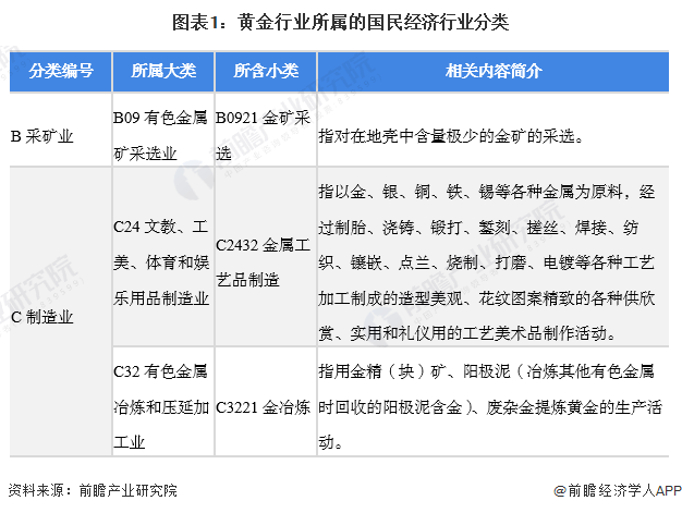 黄金是一种特殊的贵金属,具有商品和金融双重属性,黄金需求主要分为商品制造消费和市场投资需求两大类。根据国家统计局《国民经济行业分类》(2019年修订版)(GB/T4754-2017)标准,黄金行业主要包含金矿采选行业、金冶炼行业以及珠宝首饰及有关物品的制造行业等。金矿采选行业属于采矿业类别,所属大类为“有色金属矿采选(B09)”,指对在地壳中含量极少的金矿的采选;金冶炼行业属于制造业,大类为“有色金属冶炼和压延加工业(C32)”,指用金精(块)矿、阳极泥(冶炼其他有色金属时回收的阳极泥含金)、废杂金提炼黄金的生产活动;珠宝首饰及有关物品的制造行业同属于制造业,所属大类为“文教、工美、体育和娱乐用品制造业(C24)”,指以金、银、铜、铁、锡等各种金属为原料,经过制胎、浇铸、锻打、錾刻、搓丝、焊接、纺织、镶嵌、点兰、烧制、打磨、电镀等各种工艺加工制成的造型美观、花纹图案精致的各种供欣赏、实用和礼仪用的工艺美术品制作活动。