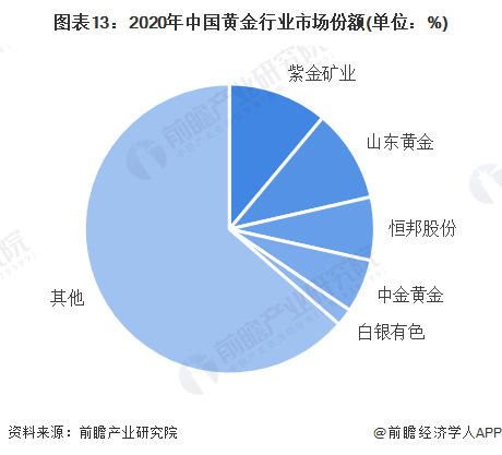 目前,中国黄金行业龙头企业分别是紫金矿业、山东黄金。2020年,按黄金产量来看,紫金矿业的市场份额达11%,山东黄金的市场份额达10%。