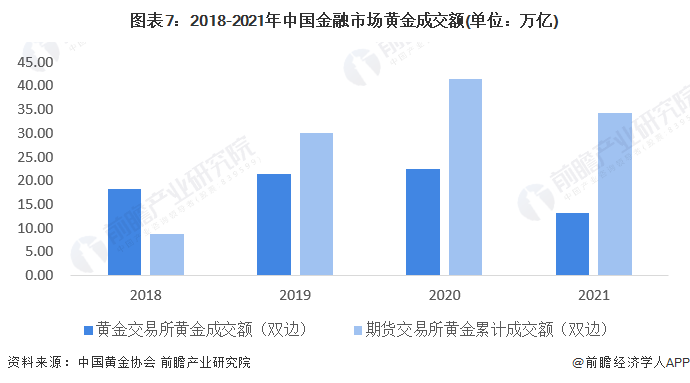 从投资金融交易市场来看,2021年,上海黄金交易所全部黄金品种累计成交3.48万吨(双边),同比下降41%,成交额13.08万亿元,同比下降42%;上海期货交易所全部黄金品种累计成交量9.71万吨(双边),同比下降11.3%,成交额34.19万亿元,同比下降17.5%。