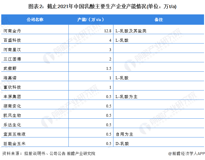 河南金丹科技是我国的乳酸行业的龙头企业,拥有12.8万吨的乳酸产能。其他生产乳酸的企业的产能较小,有一半企业的产能不足1万吨。