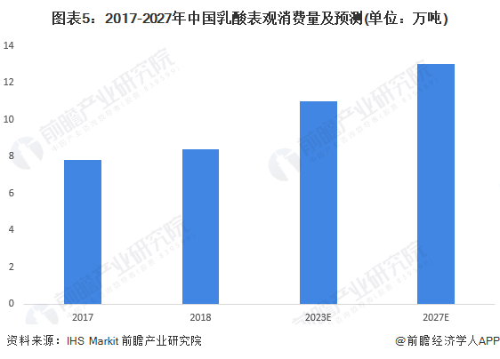 根据IHSMarkit数据显示,2018年全球乳酸市场消费量约为51.8万吨,未来5年以5.6%的复合增速增长;国内表观消费量为8.38万吨,同比增长7.3%。乳酸行业的增长一方面来自于传统领域食品和饮料市场的需求拉动,另一方面药品和个人护理用品也将保持稳步增长,除此之外下游聚乳酸行业市场规模在迅速增加,将成为乳酸增长的重要动力。前瞻认为中国乳酸市场消费量在下游应用领域高速发展的大环境下将保持持续保持增长态势,年复合增长率约为6%,在2027年有望超过13万吨。