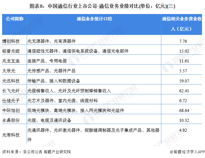 目前,我国通信产业的上市公司数量较多,分布在各产业链环节。其中,上游通信零部件制造业的上市企业主要包括灿勤科技(688182)、创远仪器(831961)、神宇股份(832026)等;中游通信设备制造业的企业(上市和非上市)主要包括中兴通讯(000063)、华为、小米集团(01810)、vivo、oppo以及苹果、三星等外国企业;电信运营服务的上市公司有中国移动(600941)、中国电(601728)、中国联通(600050);光通信行业的上市企业主要有烽火通信(600498)、中天科技(600522)、亨通光电(600487)、富通信息(000836)、通鼎互联(300004)、特发信息(000070)等。