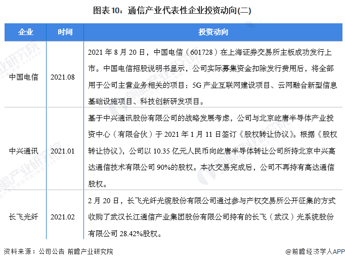 从代表性企业分布情况来看,广东、北京、江苏、湖北、四川等地代表性企业较多;其中广东和北京地区龙头企业较多,如广东地区拥有中兴通讯、华为、vivo等企业;三大运营商和小米集团都坐落于北京地区;同时,就光通信行业来说,湖北为我国光通信行业企业最多的地区(主要在武汉市),拥有烽火通信、长飞光纤等行业龙头企业。