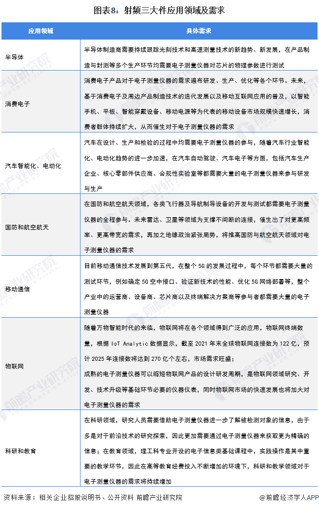 从具体的应用领域来看,射频三大件的下游应用行业基本相同,具体包括半导体、消费电子、移动通信、汽车电子、自动驾驶、车联网、物联网、国防与航空航天、科研与教育等,其中多个下游应用行业加速发展,有望催化测量仪器需求的高速增长。