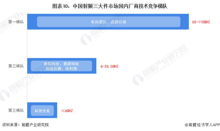 在具体企业的产品性能方面,电科思仪在射频三大件产品中均代表了国内厂商的最高水平,其次是成都玖锦,其射频三大件产品性能紧随其后,均接近国内厂商的最高水平。