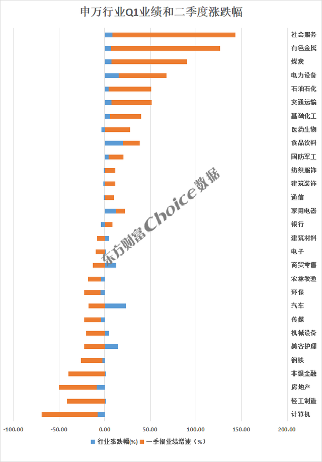 4月末,随着A股一季报披露完毕,市场迎来反弹行情。这期间,一季报业绩高增长的社会服务、有色金属、煤炭、电力设备、食品饮料等行业表现出色。Choice数据显示,有色金属行业一季报业绩增长119.61%,二季度板块上涨6.82%;电力设备行业一季报业绩增长52.72%,二季度板块上涨15.10;食品饮料一季报业绩增长18.12%,二季度板块上涨20.19%。相反,业绩增速下滑的行业则多数跑输市场平均水平。