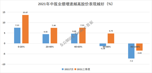 业绩增长幅度前20%的个股2021年7月平均涨幅7.53%(已剔除新股,下同),三季度平均涨幅13.67%;业绩增长分布在20%-40%区间的个股7月平均涨幅4.42%,三季度平均涨幅7.44;业绩增长分布在40%-60%的个股7月平均涨幅4.68%,三季度平均涨幅7.55%;业绩增长分布在60%-80%的个股7月平均下跌1.28%,三季度平均涨幅4.79%;业绩增速分布在80%之后的个股7月平均下跌7.2%,三季度平均下跌3.44%。