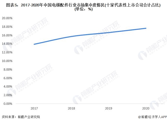 从市场集中度来看,中国电梯配件行业集中度较低,2020年十家国内代表性上市公司合计占据17.61%的市场份额。且市场集中度呈现逐年上升的趋势。