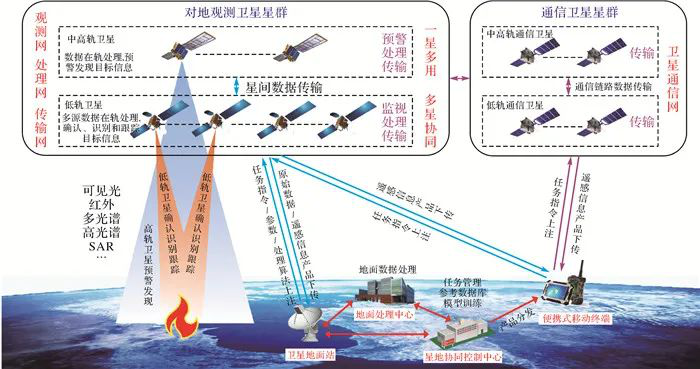 面向星群的遥感影像智能服务能够集任务描述、任务管控、任务规划、在轨处理、终端分发为一体。以多尺度动态任务本体描述模型为驱动,对任务进行统一管理和自主生成,通过将用户应用反馈到任务管理环节来不断更新对地观测任务需求分析,完善用户服务体系,实现卫星资源的最大化利用。充分利用对地观测卫星星群中各类卫星资源的优势,通过中高轨预警发现,低轨确认、识别和跟踪的方式,兼得任务的时间和空间分辨率。星群中的每颗卫星一星多用多功能设计,卫星集观测、处理和传输功能于一体,每颗卫星既是任务观测节点,同时也是计算单元和数据传输节点,通过一星多用、多星协同的方式星群内部可以组成观测网、处理网和传输网,与卫星通信网集成实现对全球范围遥感信息的实时智能服务。