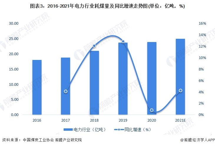 从能源消耗来看,火力发电的耗煤量近三年稳定在20亿吨左右。2016-2020年,我国电力行业煤炭消耗量呈上升的趋势。2020年,电力行业煤炭消耗量为23.89亿吨,同比增长0.8%,占煤炭总消耗量的59.1%。2021年,全国电力供需形势总体偏紧,煤炭作为稳定性高的发电方式之一,承担主要发电任务,且2021年中央煤炭企业产量首次突破10亿吨,全国原煤产量同比增长4.7%达到40.7亿吨,创历史新高。前瞻依据历年发电结构、电力行业的耗煤量以及原煤产量增长情况,测算2021年电力行业的耗煤量突破24亿吨。