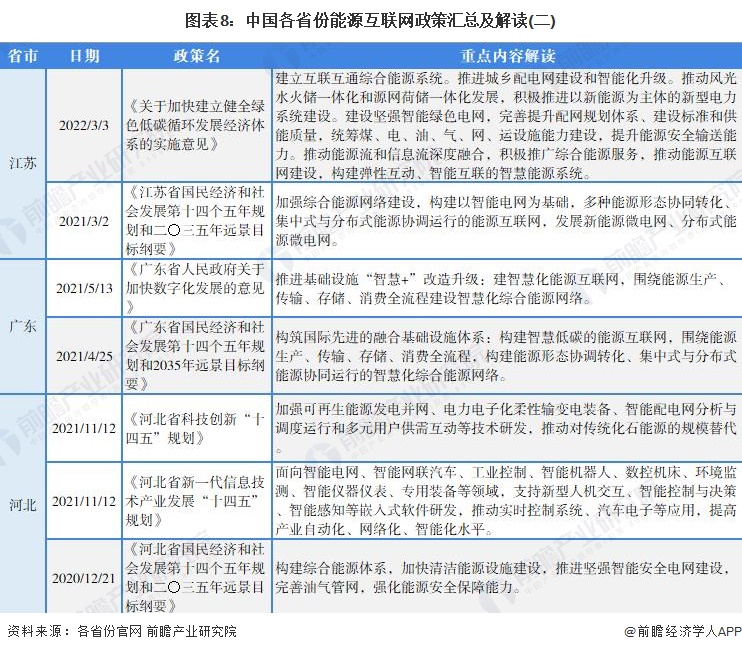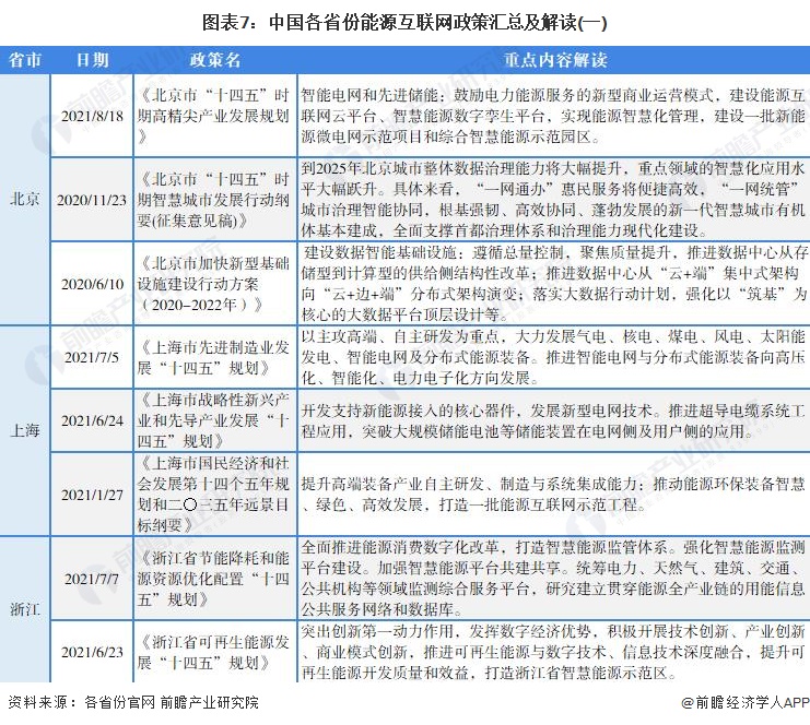 “十四五”期间,我国主要省份也提出了能源互联网行业的发展目标,北京明确到2025年建设能源互联网云平台,上海要求到2025年新建20万个充电桩,加强智能电网的推进工作,其他省市也在能源互联网平台建设、分布式能源协同等方面做出规划: