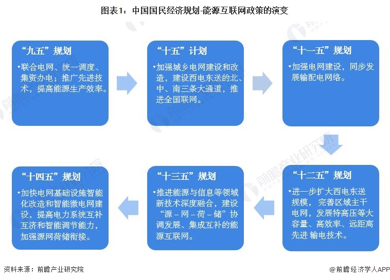 能源互联网是提升能源调度效率,利于我国能源全国联网的重要行业。从我国国民经济规划的演变来看,我国“九五”规划,提出联合电网、统一调度,早早意识到能源互联网的重要性;随后,“十五”至“十二五”规划,重点强调了扩大西电东送规模、完善电网建设等;“十三五”规划首次在顶层文件中出现能源互联网,明确建设“源-网-荷-储”协调发展、集成互补的能源互联网;“十四五”规划,明确提出加快电网基础设施智能化改造和智能微电网建设,加强源网荷储衔接。
