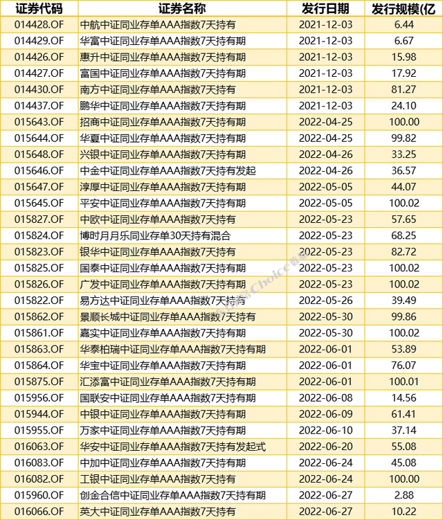 如前文所说,多数基金跟踪的是中证同业存单AAA指数,其样本券由银行间市场上市的主体评级为AAA,发行期限在1年以下,上市时间7天及以上的同业存单组成,指数的标的券个数也超1万只,因此市面上的同业存单基金大多信用等级高,投资标的可选范围广,能够有效进行投资风险分散。